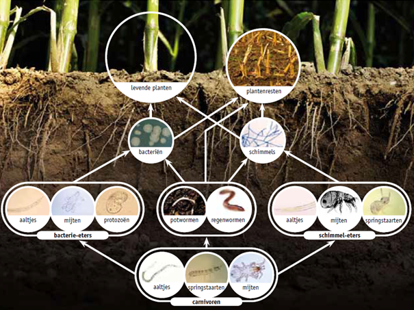Op onze akkers komen allerlei organismen, zoals regenwormen, springstaarten, schimmels en bacteriën voor. Deze organismen vormen samen het bodemvoedselweb. De bodem kan gezien worden als een complex levend systeem, waar het ‘eten en gegeten’ worden is, vandaar de naam ‘bodemvoedselweb’. Bacteriën en schimmels zijn weliswaar de kleinsten onder de bodembewoners, maar ze zijn wel met heel veel. Hoeveelheden variëren van enkele duizenden kg per ha. Alle regenwormen samen wegen ongeveer 1000 kg per ha. Bij de overige groepen gaat het om slechts tientallen tot honderden kg per ha.