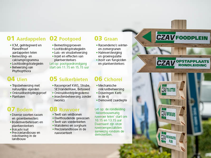 Zo’n 80 standhouders zijn aanwezig om jou te voorzien van informatie. Je vindt ze over het gehele terrein: op de infomarkt en in het veld. Heb jij een brandende vraag? Dan is dit het uitgelezen moment om hem zeker te stellen. Alle belangrijke standhouders zijn van de partij om uitleg te geven. Ook CZAV is aanwezig met een eigen stand op de infomarkt. Heb je vragen? Kom dan gerust langs bij onze stand.